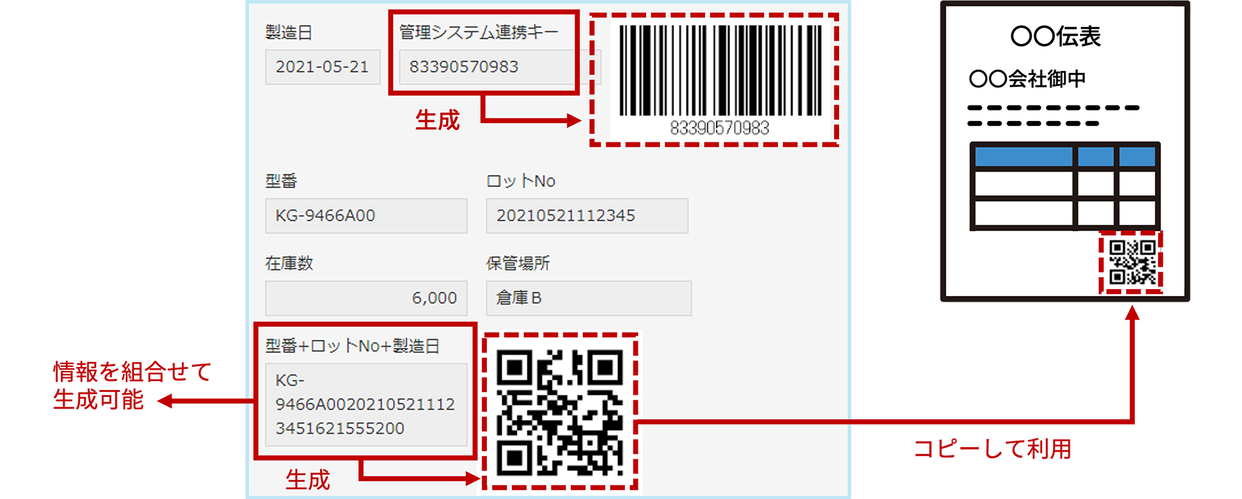 レコード詳細画面に表示されたQR・バーコードは、そのままコピーして帳票や資料へ貼り付けられるため、印刷物や外部資料への転用もスムーズにできます。