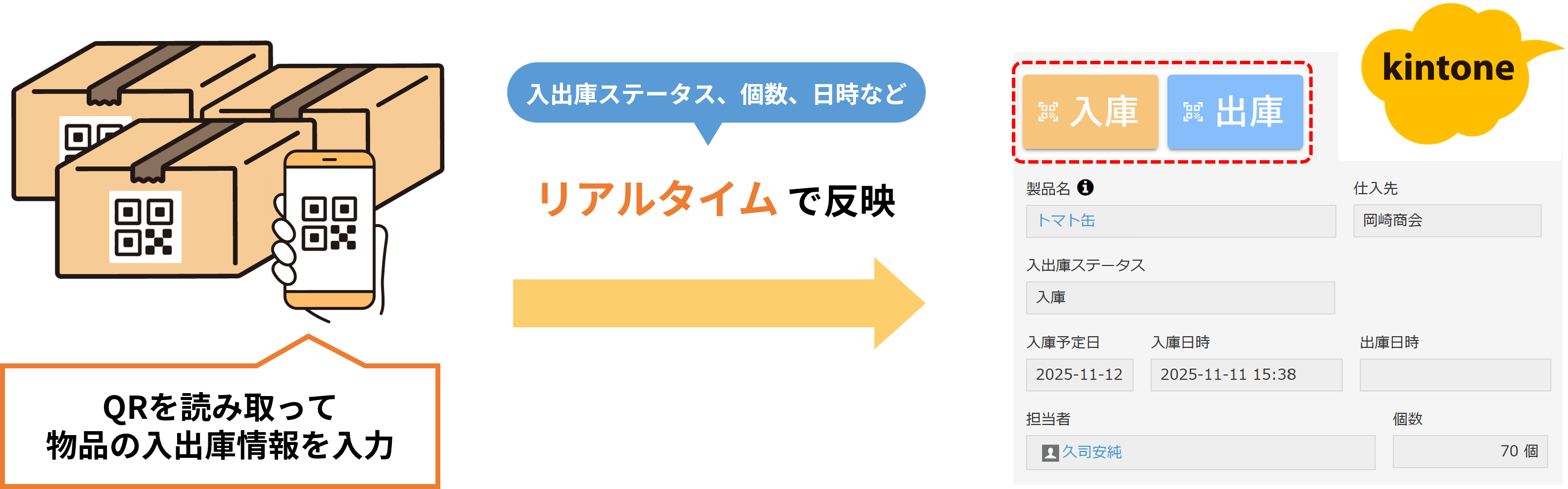 物品にQR・バーコードを貼り付け、入出庫時にスマホやタブレットで読み取るだけで、在庫をリアルタイムに管理できます。